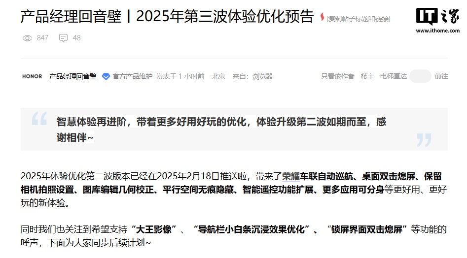 IT之家附荣耀 MagicOS 系统 2025 年第三波体验优化预告如下: