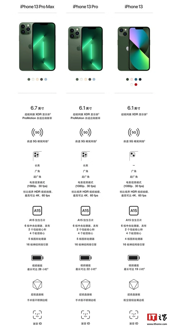 据介绍,iPhone 13 搭载 A15 仿生芯片,配备 6.1 英寸超视网膜 XDR 显示屏;该机后摄采用对角设计,含广角和超广角镜头,支持电影效果模式、杜比视界 HDR 视频拍摄。