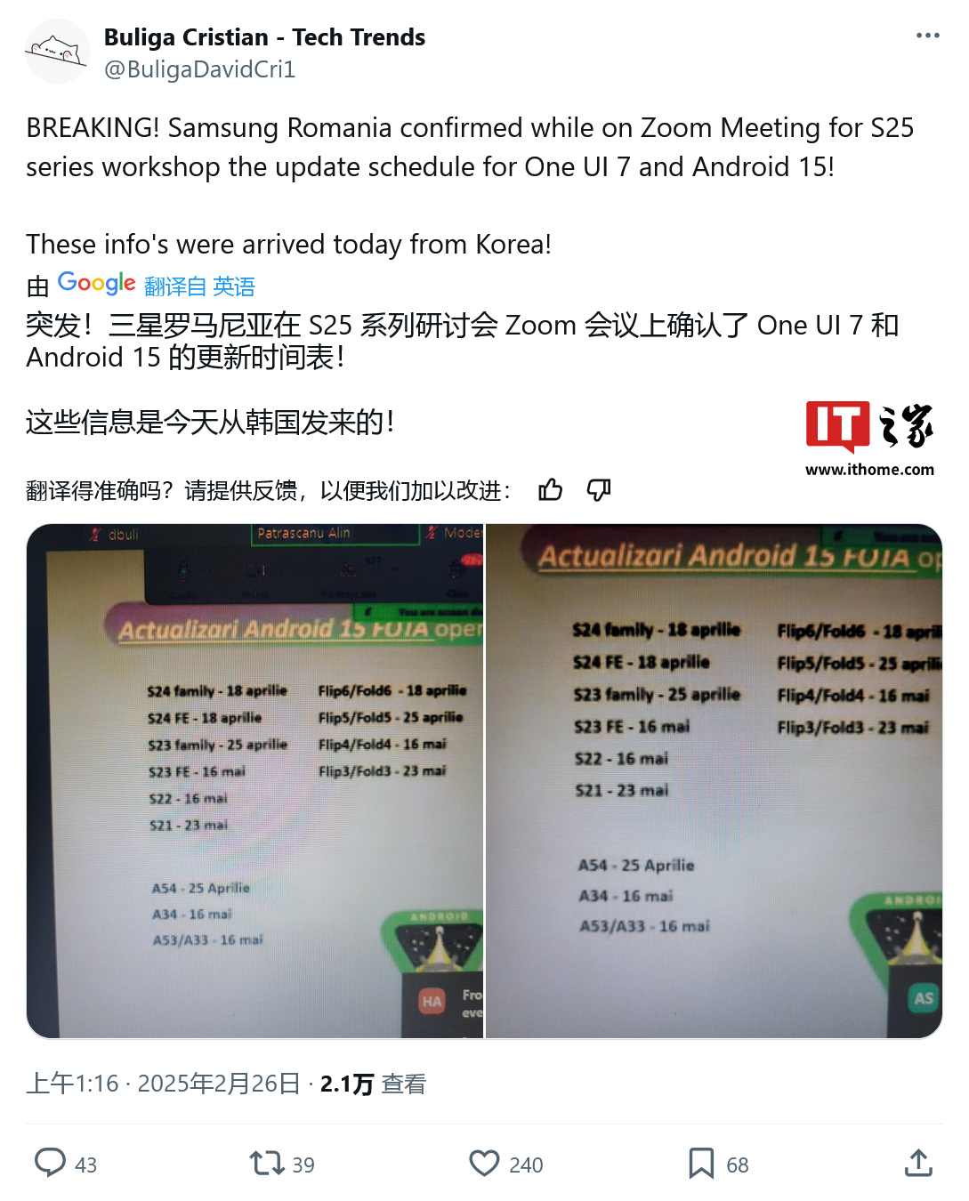 IT之家 2 月 26 日消息,消息源 Buliga Cristian 今天(2 月 26 日)在 X 平台发布推文,报道称近期在 Zoom 上举办的 Galaxy S25 系列旗舰研讨会上,三星罗马尼亚公司确认了 One UI 7 的正式推出时间表。