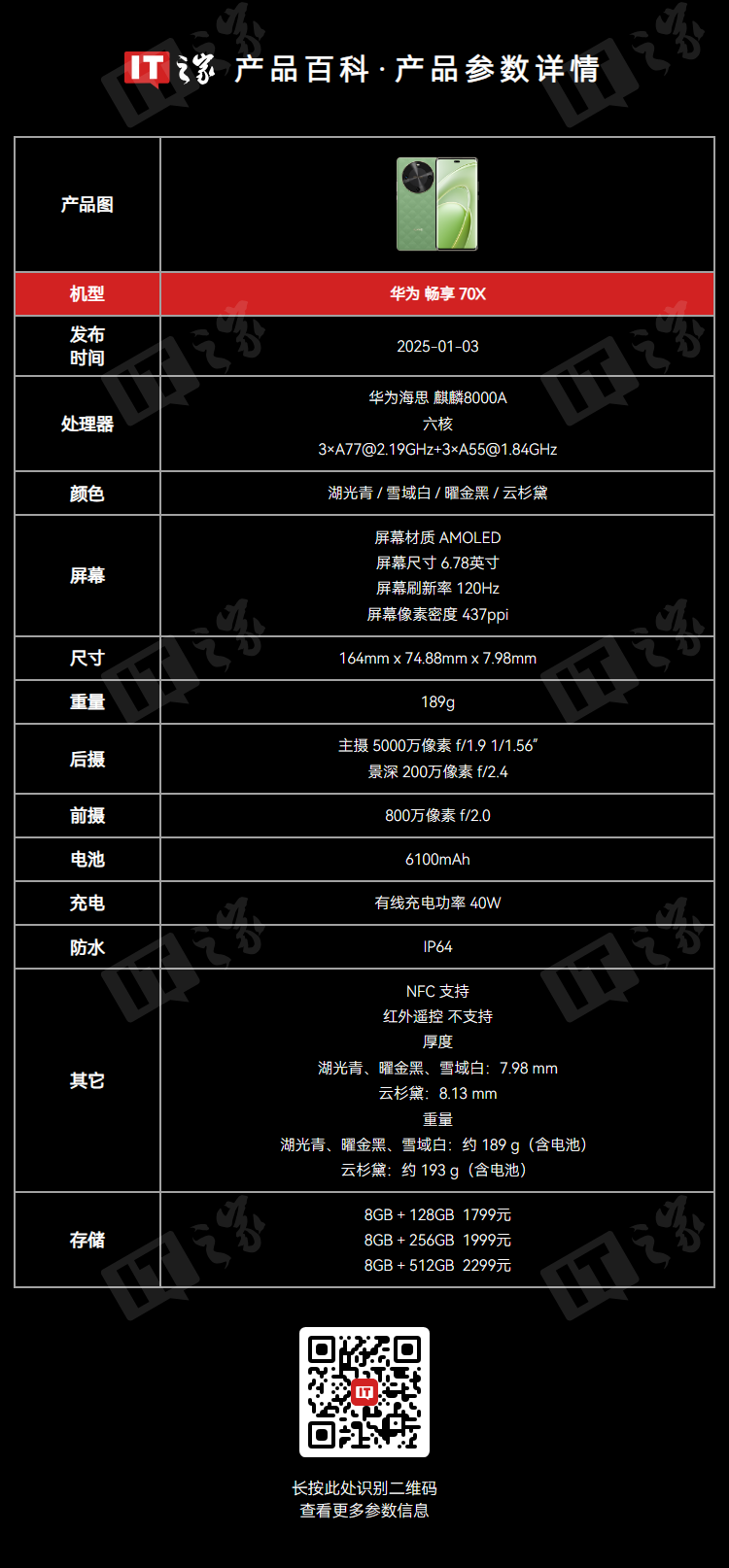 华为畅享 70X 手机于今年初发布,北斗卫星图片消息首次下放,最低配 8GB + 128GB 定价 1799 元,IT之家附参数表如下: