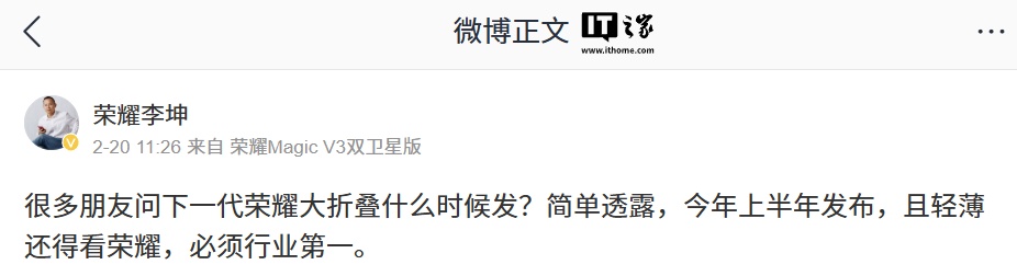 IT之家 2 月 27 日消息,荣耀终端股份有限公司旗舰手机产品经理李坤本月(2 月 20 日)确认,下一代荣耀大折叠今年上半年发布,轻薄“必须行业第一”。