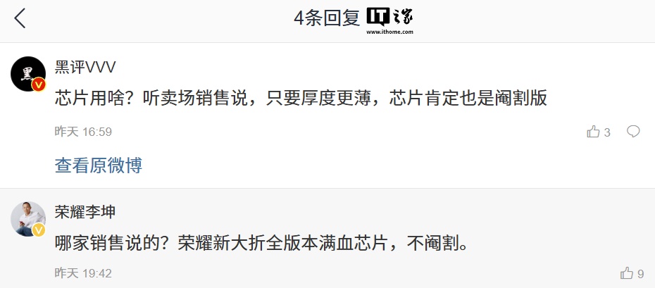 IT之家注意到,李坤昨日解答了网友对于新折叠旗舰所使用芯片是否为阉割版的疑惑:“哪家销售说的?荣耀新大折全版本满血芯片,不阉割。”