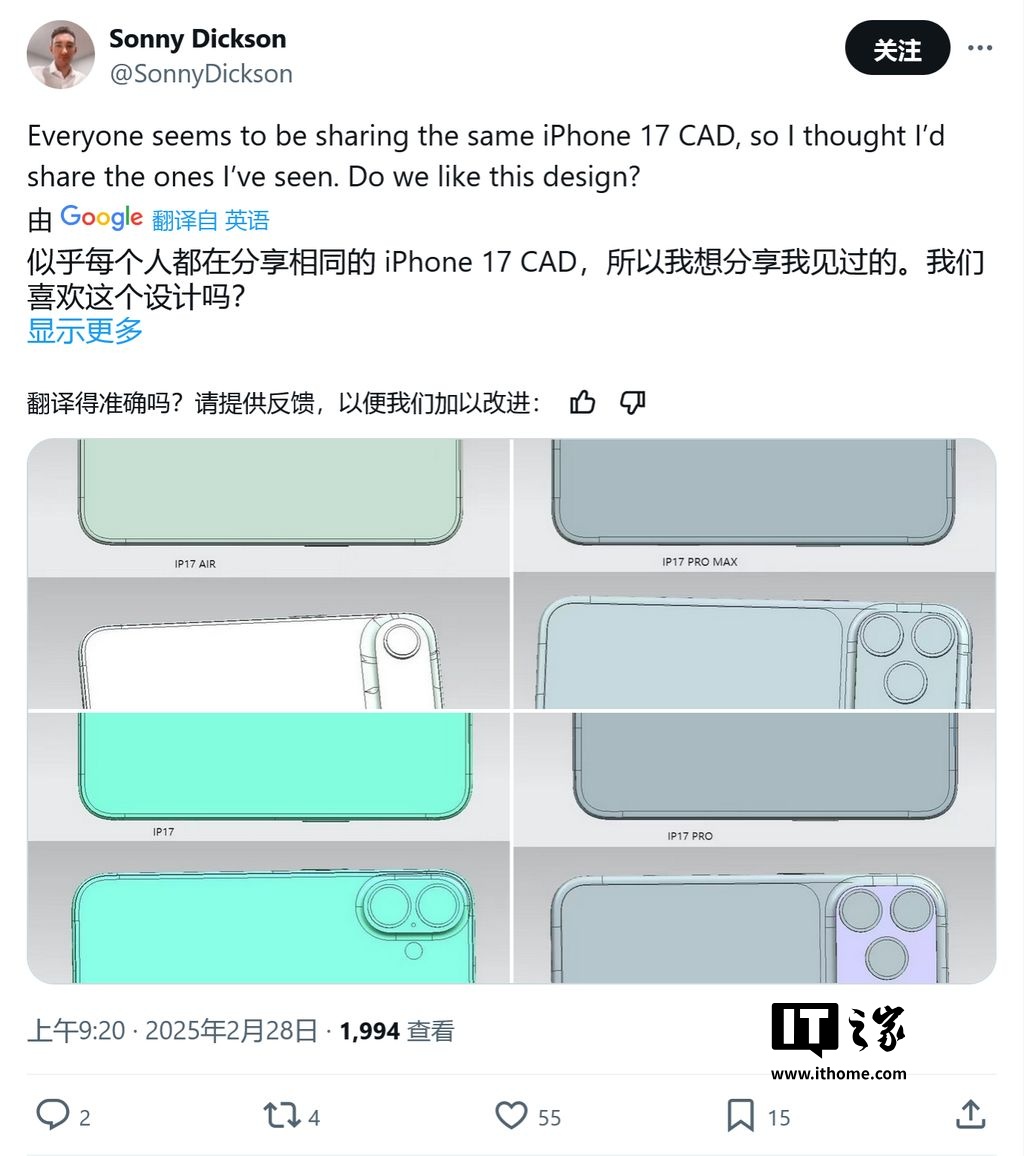 IT之家 2 月 28 日消息,消息源 Sonny Dickson 今天(2 月 28 日)在 X 平台发布推文,分享了一组 CAD 文件图片,展示了 iPhone 17、iPhone 17 Air、iPhone 17 Pro 和 iPhone 17 Pro Max 的设计和尺寸,进一步佐证了此前曝光的概念图。