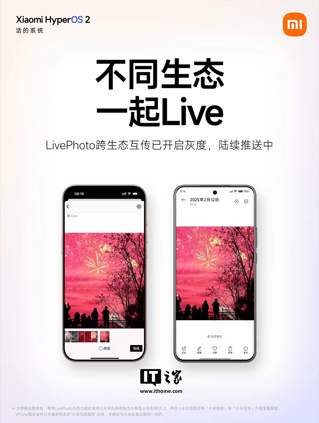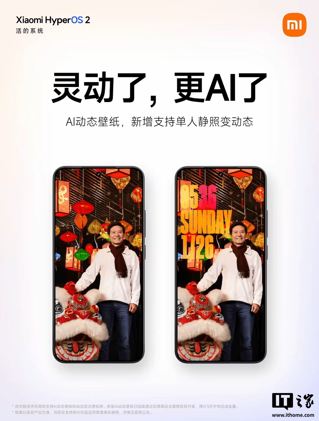 据介绍,小米 AI 动态壁纸新增支持单人静照变动态;LivePhoto 跨生态互传功能支持小米手机和 iPhone 互相发送实况照片。