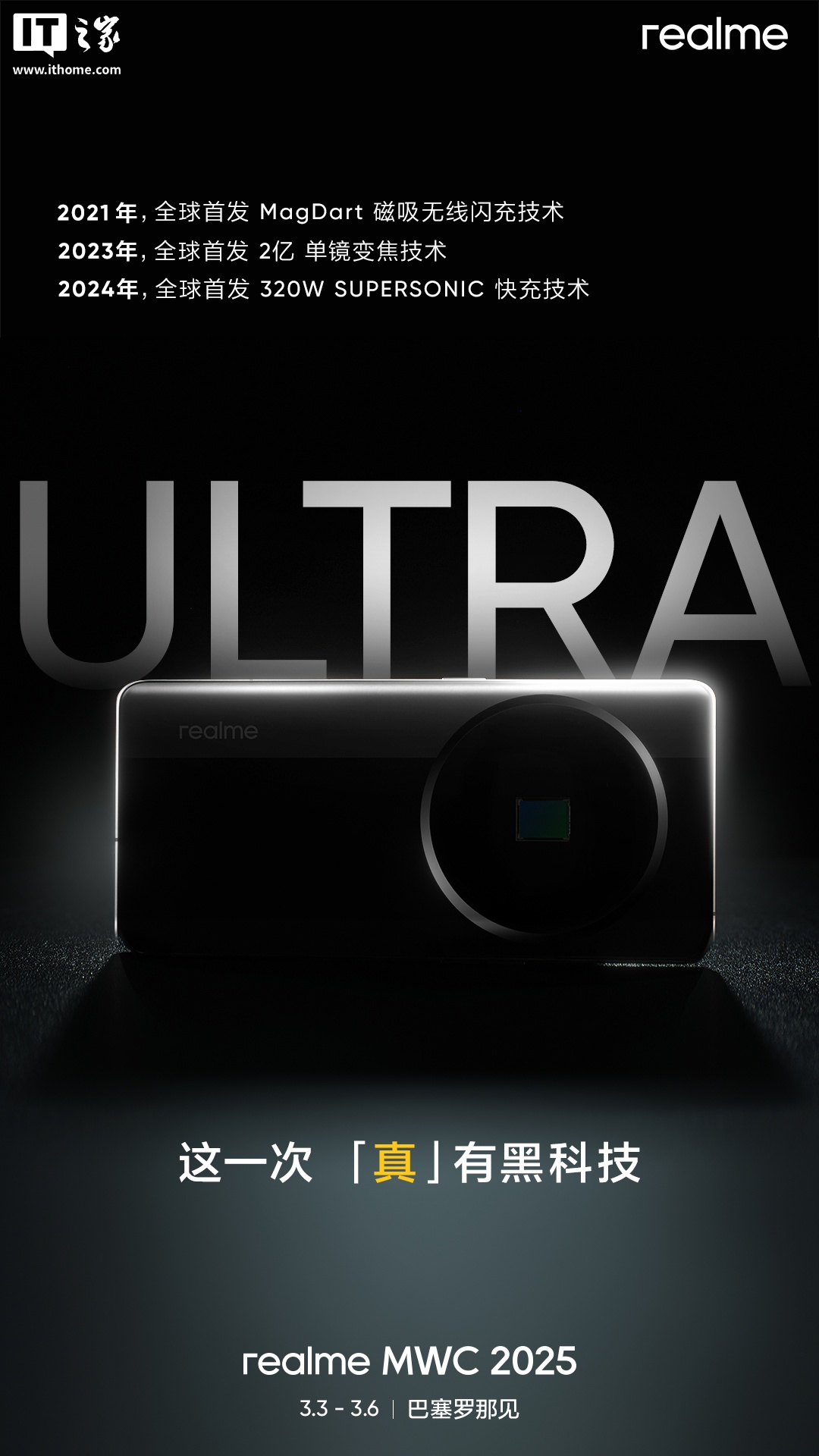 IT之家 2 月 28 日消息,真我手机官方昨日宣布搭载「Ultra 级黑科技」新机将在巴塞罗那 MWC 2025(3 月 3 日-3 月 6 日)正式亮相。