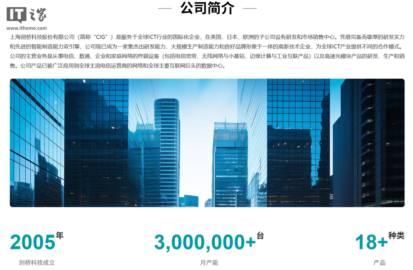 上海剑桥科技股份有限公司(简称“CIG”)成立于 2005 年,在美国、日本、欧洲的子公司设有研发和市场销售中心,其主营业务是从事电信、数通、企业和家庭网络的终端设备(包括电信宽带、无线网络与小基站、边缘计算与工业互联产品)以及高速光模块产品的研发、生产和销售。