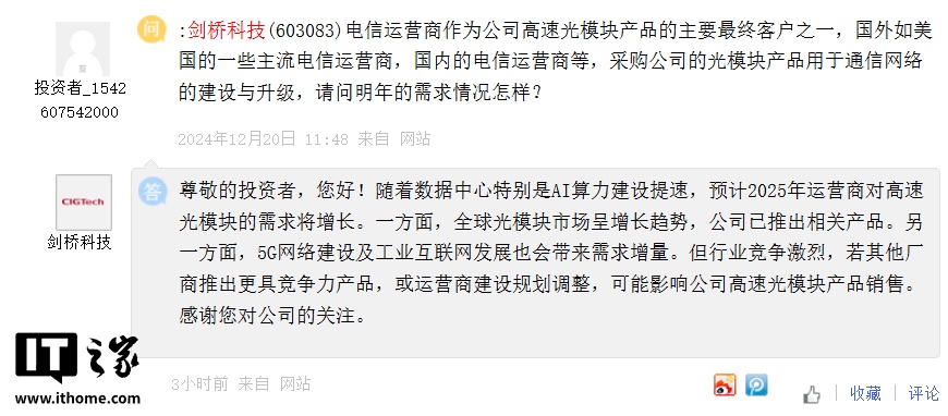 IT之家 2 月 28 日消息,剑桥科技今日在互动平台回复投资者提问时表示:随着数据中心特别是 AI 算力建设提速,预计 2025 年运营商对高速光模块的需求将增长。一方面,全球光模块市场呈增长趋势,公司已推出相关产品。另一方面,5G 网络建设及工业互联网发展也会带来需求增量。