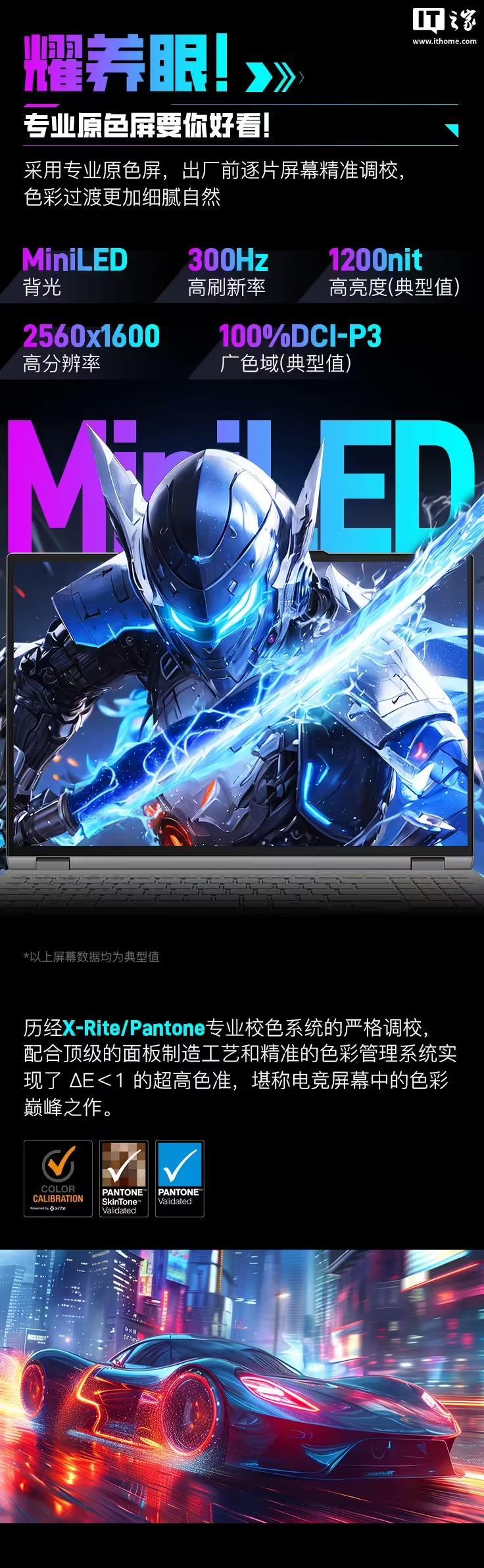 耀世 16 Ultra 搭载了一块 16 英寸 2560×1600 分辨率 300Hz 高刷新率的 Mini LED 面板,拥有 1200 尼特亮度,其色域覆盖达 100% DCI-P3,同时色差 ΔE