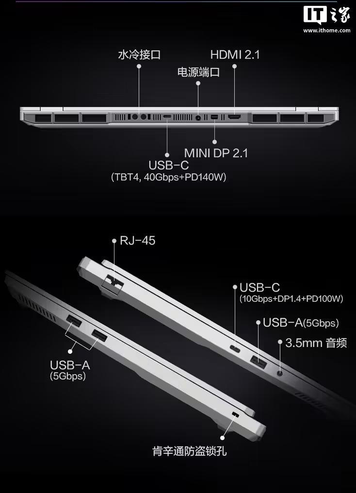 此外,该游戏本搭载 99Wh 电池,配备 420W 小型碳化硅 SiC 电源适配器,支持 140W 私有协议 USB-C 快充,标称质量为 2.55kg。
