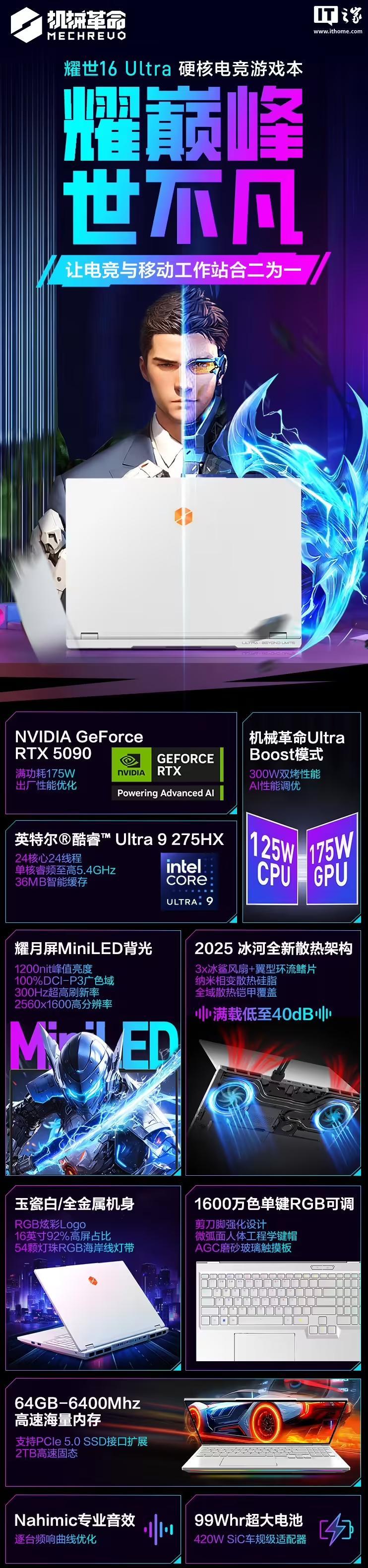 IT之家 3 月 1 日消息,机械革命宣布旗下耀世 16 Ultra 旗舰游戏本将于 3 月 31 日首销,该笔记本顶配搭载英特尔酷睿 Ultra 9 275HX 处理器英伟达 GeForce RTX 5090 笔记本电脑 GPU,支持外接水冷散热系统,但价格信息尚未公布。