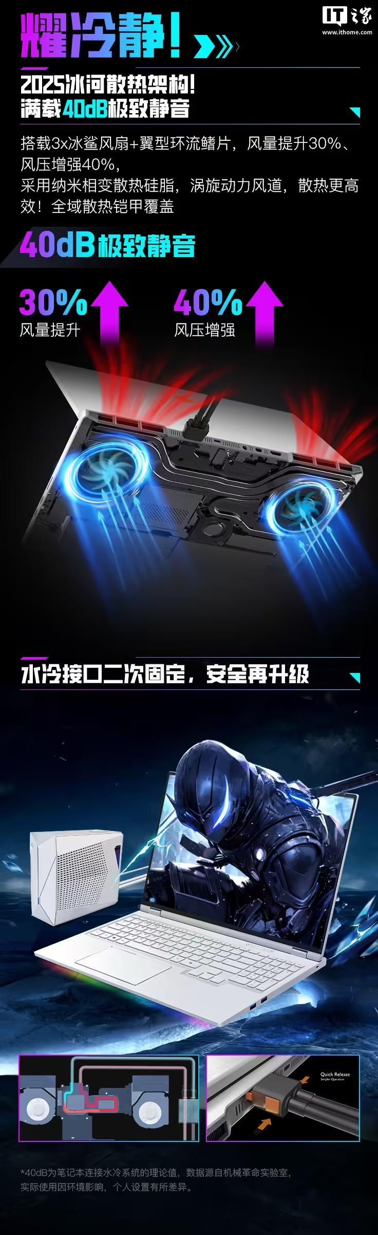 在散热方面,该机采用了相变硅脂 + 多热管 + 三风扇 + 外置水冷的散热组合,其风扇风量提升 30%、风压增强 40%。在外接水冷系统时其支持合计 300W 双烤、GPU 175W 满血释放,同时噪声低至 40dB。