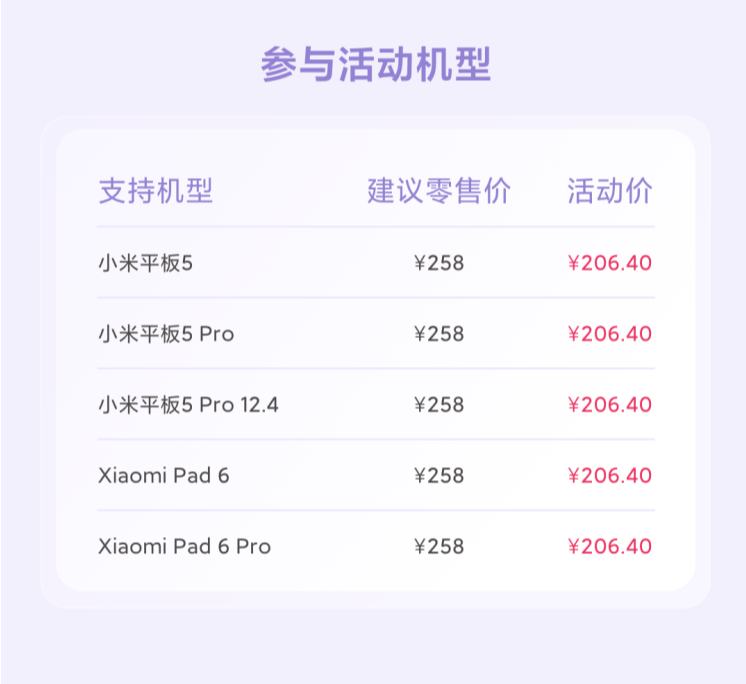 5 款平板电池换新 8 折优惠,包含小米平板 5、小米平板 5 Pro、小米平板 5 Pro 12.4、小米平板 6、小米平板 6 Pro。