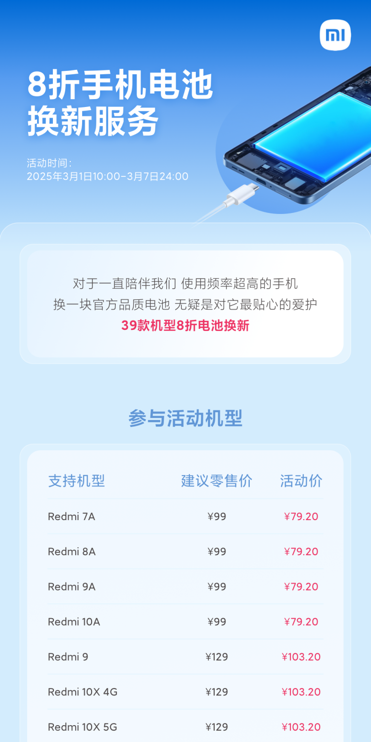 文章来源于互联网:IT之家-小米春季服务周启动:39 款机型电池换新 79.2 元起,笔记本深度清洁 49.5 元