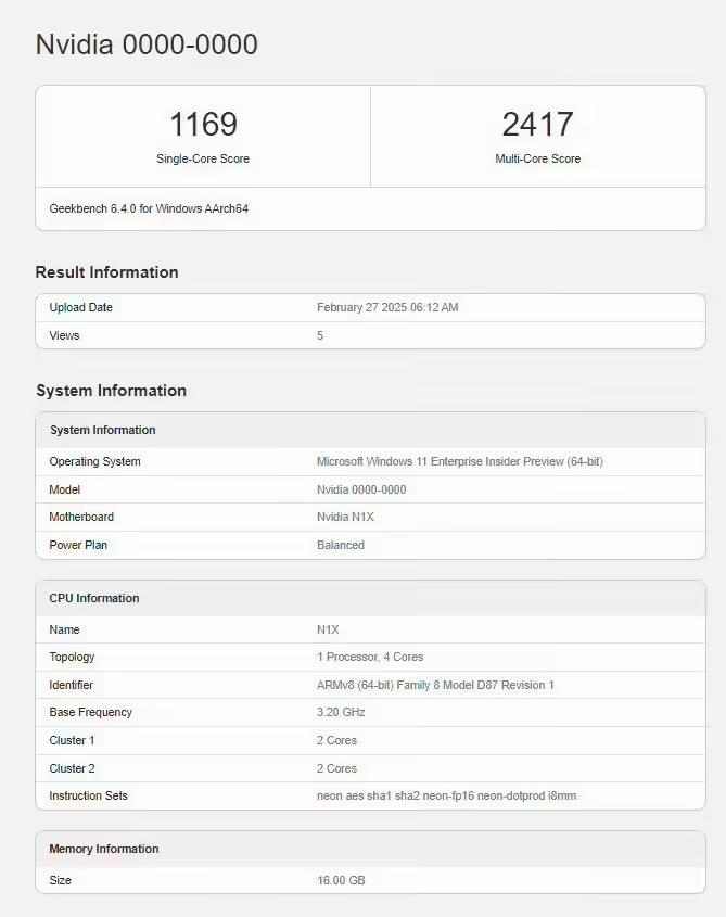 IT之家 3 月 1 日消息,@Jukanlosreve 昨天发现,有一款搭载 NVIDIA N1X 芯片的工程机出现在了 Geekbench 上,这也就是英伟达传闻中的 Arm 高端笔记本电脑芯片。