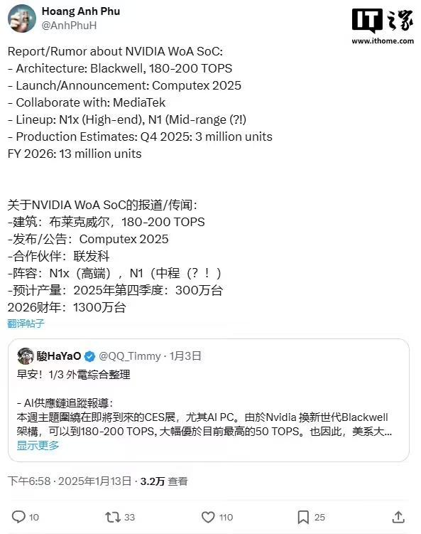 年初有消息称英伟达计划在 CES 2025 上展示这款 SoC,但实际并未出现。市场仍预测 NVIDIA 最快会在 5 月的 COMPUTEX 台北电脑展上展示这款 SoC,与高通骁龙 X 系列展开竞争。