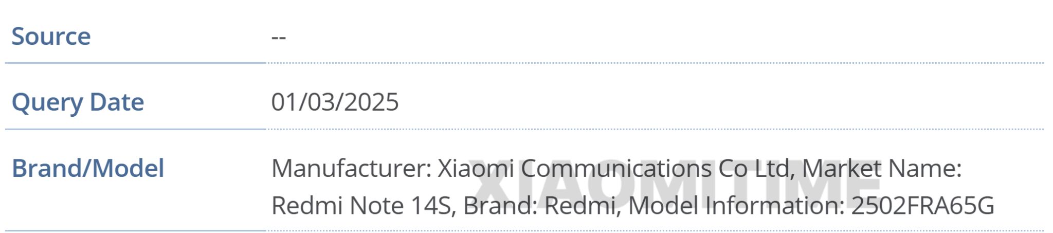 IT之家 3 月 2 日消息,科技媒体 xiaomitime 昨日(3 月 1 日)发布博文,通过挖掘 GSMA IMEI 数据库,发现了小米 REDMI Note 14S 手机的踪迹,代号为 2502FRA65G,从数字“2502”判断应该会在今年春季发布。