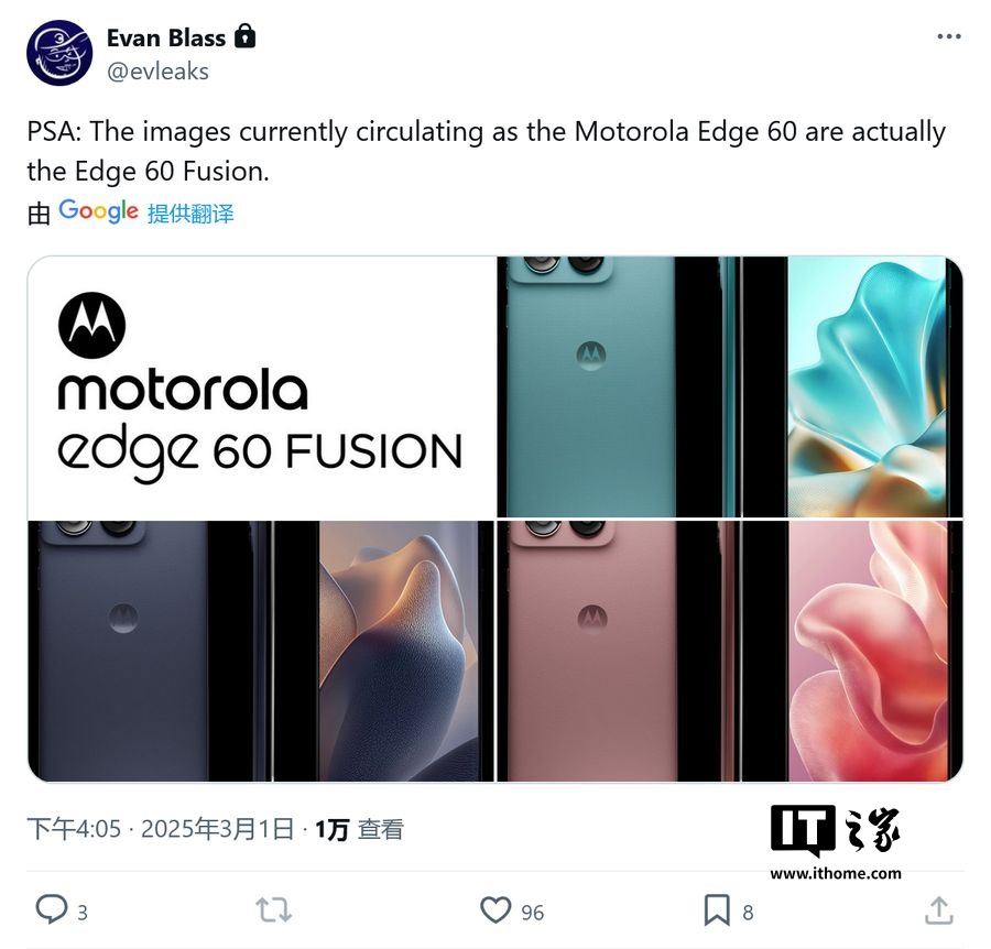 IT之家 3 月 2 日消息,消息源 Evan Blass(@evleaks)昨日(3 月 1 日)在 X 平台发布推文,分享了摩托罗拉 Edge 60 Fusion 手机的高清渲染图,采用曲面屏和极窄边框设计。