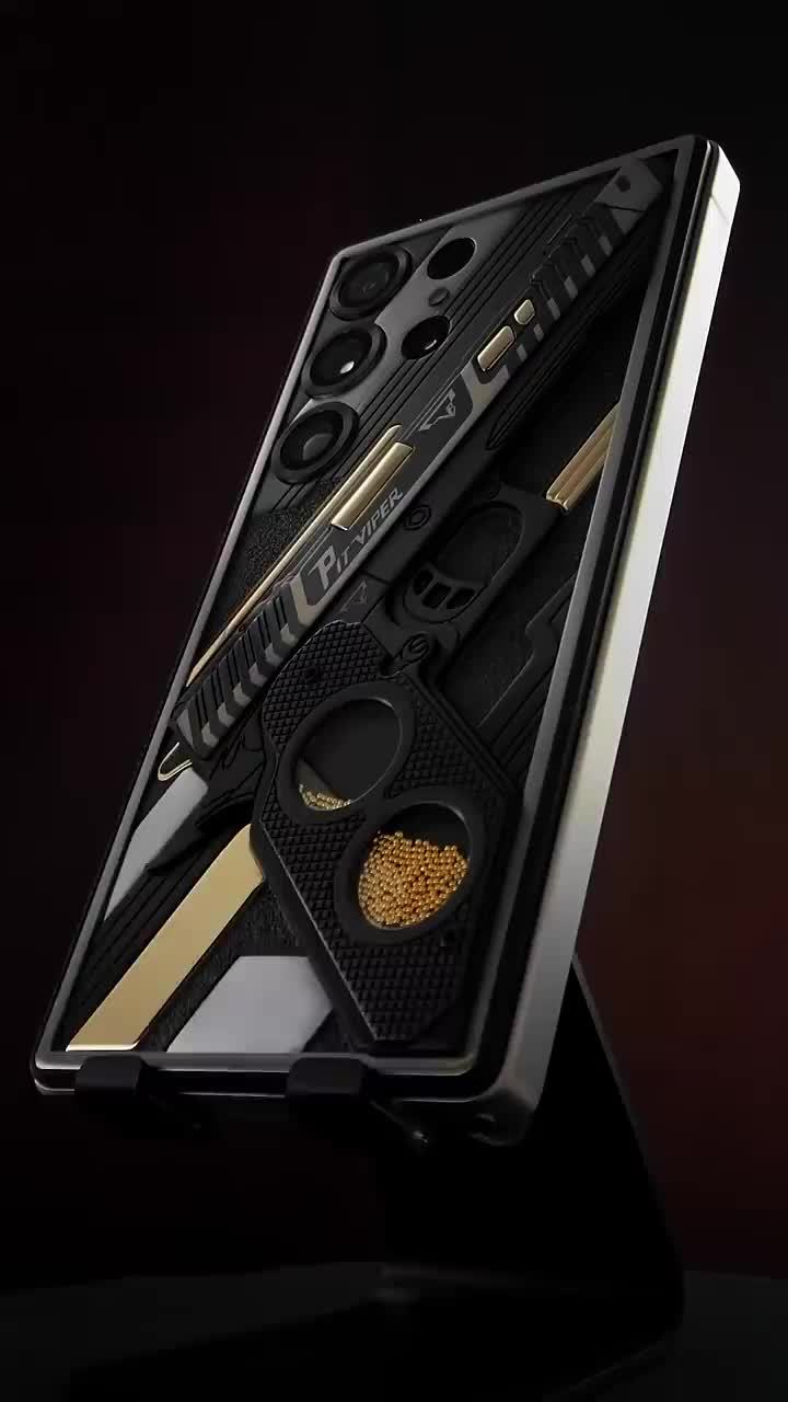 Galaxy S25 Ultra Viper 采用深黑色钛金属机身,表面涂有与瑞士名表相同的 PVD 涂层,机身还配有镀金装饰和手枪握把图案,握把内嵌沙漏设计,致敬《John Wick》系列中的标志性武器。