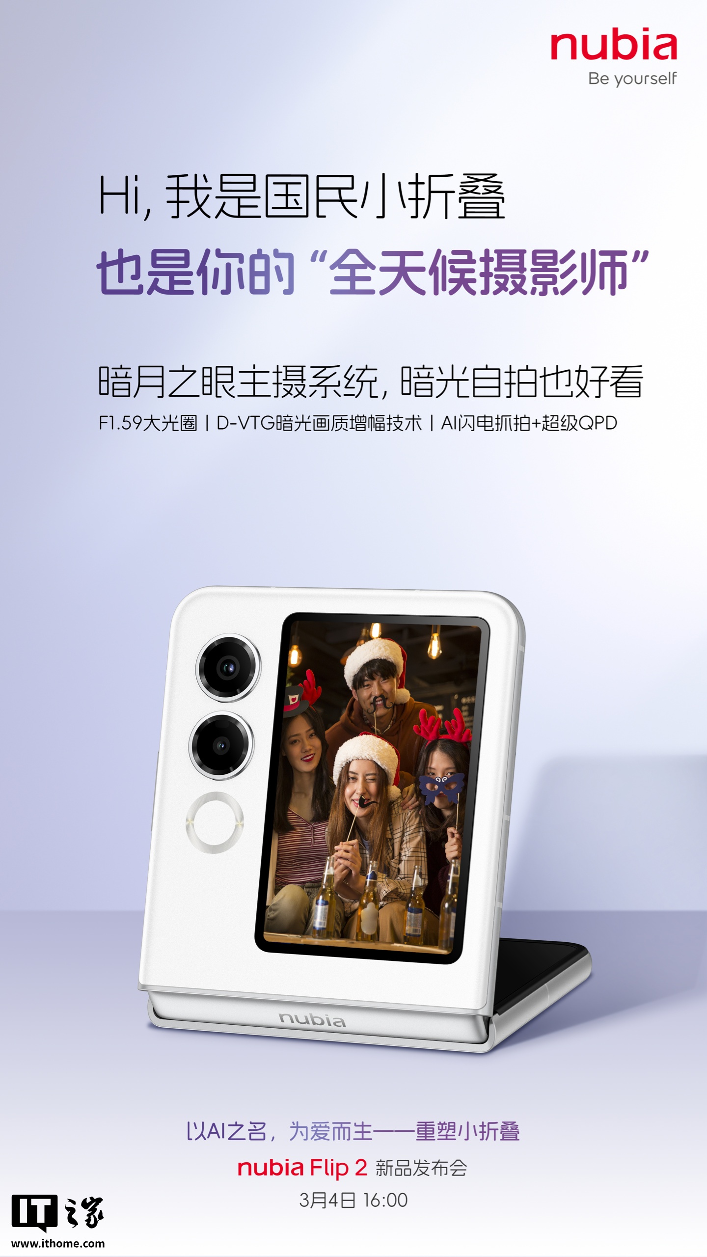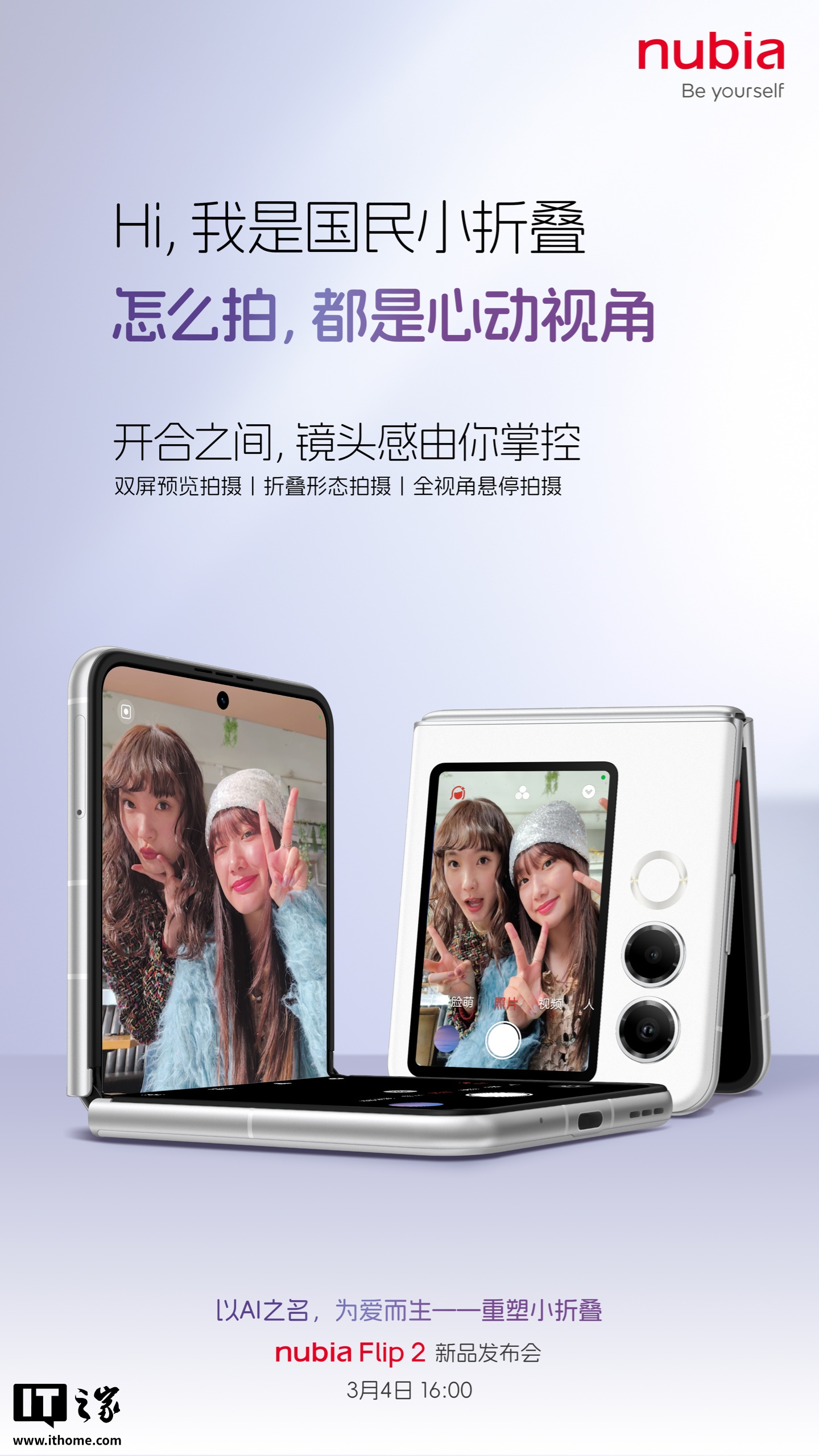 IT之家 3 月 2 日消息,努比亚 Flip 2 小折叠手机外观已正式公布,确认提供雪钻白、星光黑、冰晶紫三款配色。新机号称“新一代国民小折叠”,将于 3 月 4 日 16:00 发布。