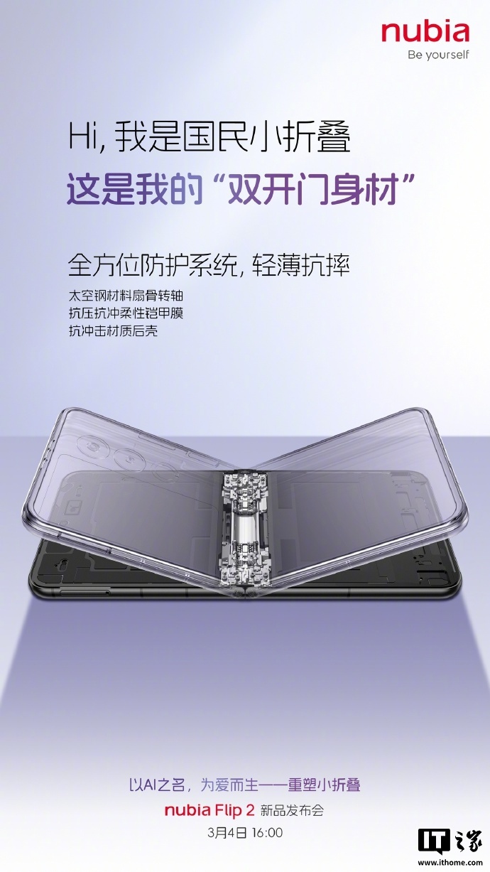 文章来源于互联网:IT之家-努比亚 Flip 2 小折叠手机配备太空钢材料扇骨转轴、支持双屏预览拍摄