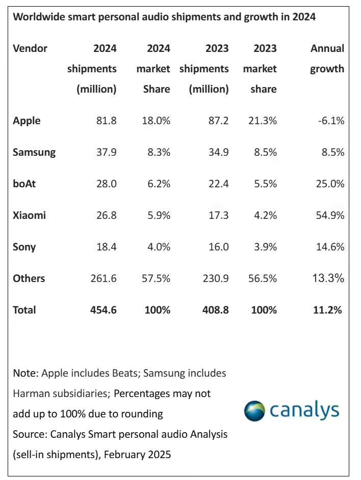 IT之家 3 月 3 日消息,根据 Canalys 最新估计,2024 年全球智能个人音频设备(包括 TWS、无线耳机和无线耳塞)出货量达到 4.55 亿台,同比增长 11.2%。所有产品类别的出货量均有所增长,其中中国和新兴市场(亚太、拉美、中东和非洲地区)是主要增长引擎。Canalys 预测,到 2025 年,全球智能音频设备出货量将超过 5 亿台,前景谨慎乐观。