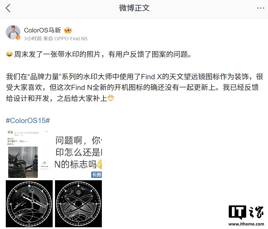 OPPO ColorOS 用户体验与解决方案总监马新今日发文对水印大师图案问题进行说明,他表示,在“品牌力量”系列的水印大师中使用了 Find X 的天文望远镜图标作为装饰,但这次 Find N 全新的开机图标的确还没有一起更新上,该情况已经反馈给设计和开发,之后补上。