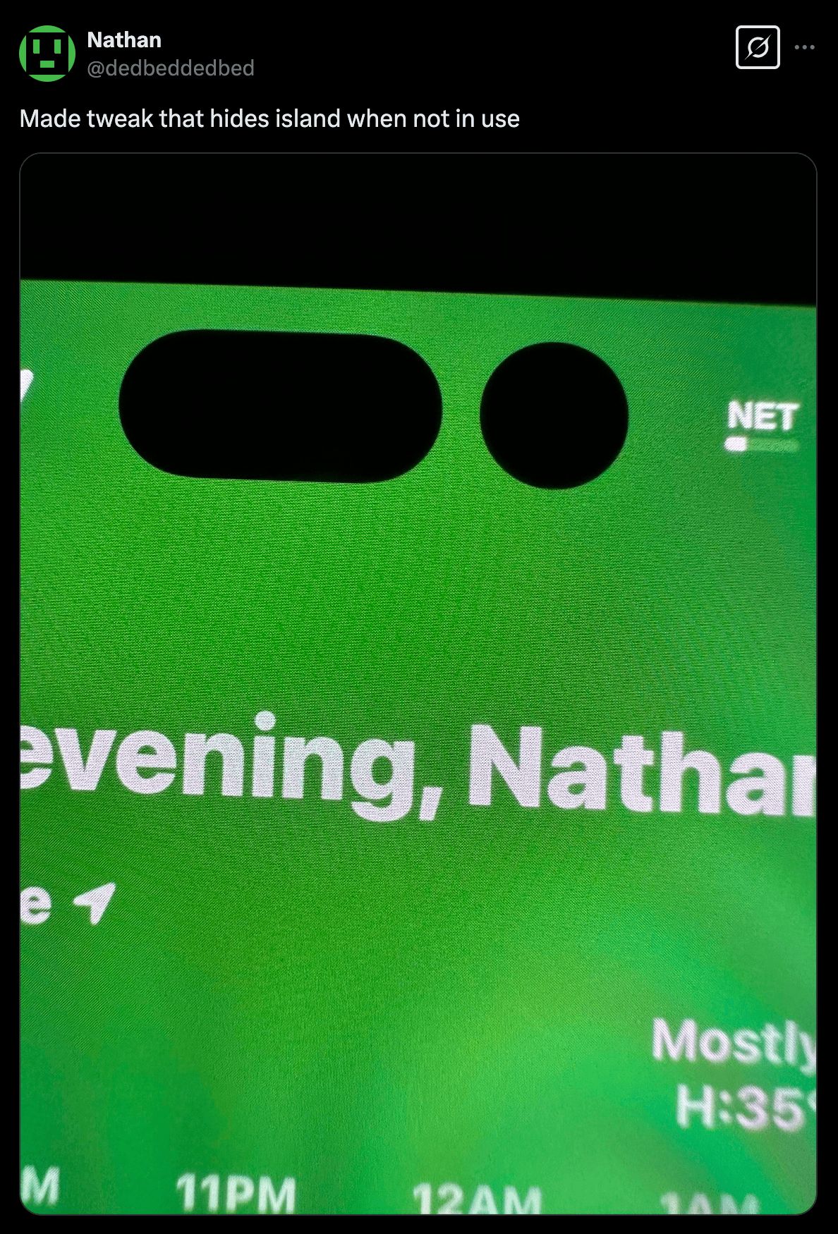 而最新推出的 DynamicNotLand 插件,可以激活 TrueDepth 相机系统之间的像素,让用户在不使用动态岛时看到更多显示内容,类似于安卓手机的打孔前置摄像头设计。