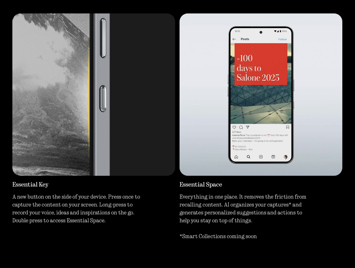 官方介绍了系列手机新增的专属物理按键“Essential Key”,支持配置多种功能: