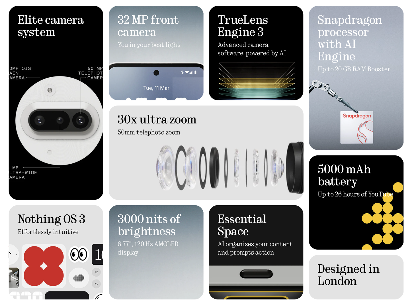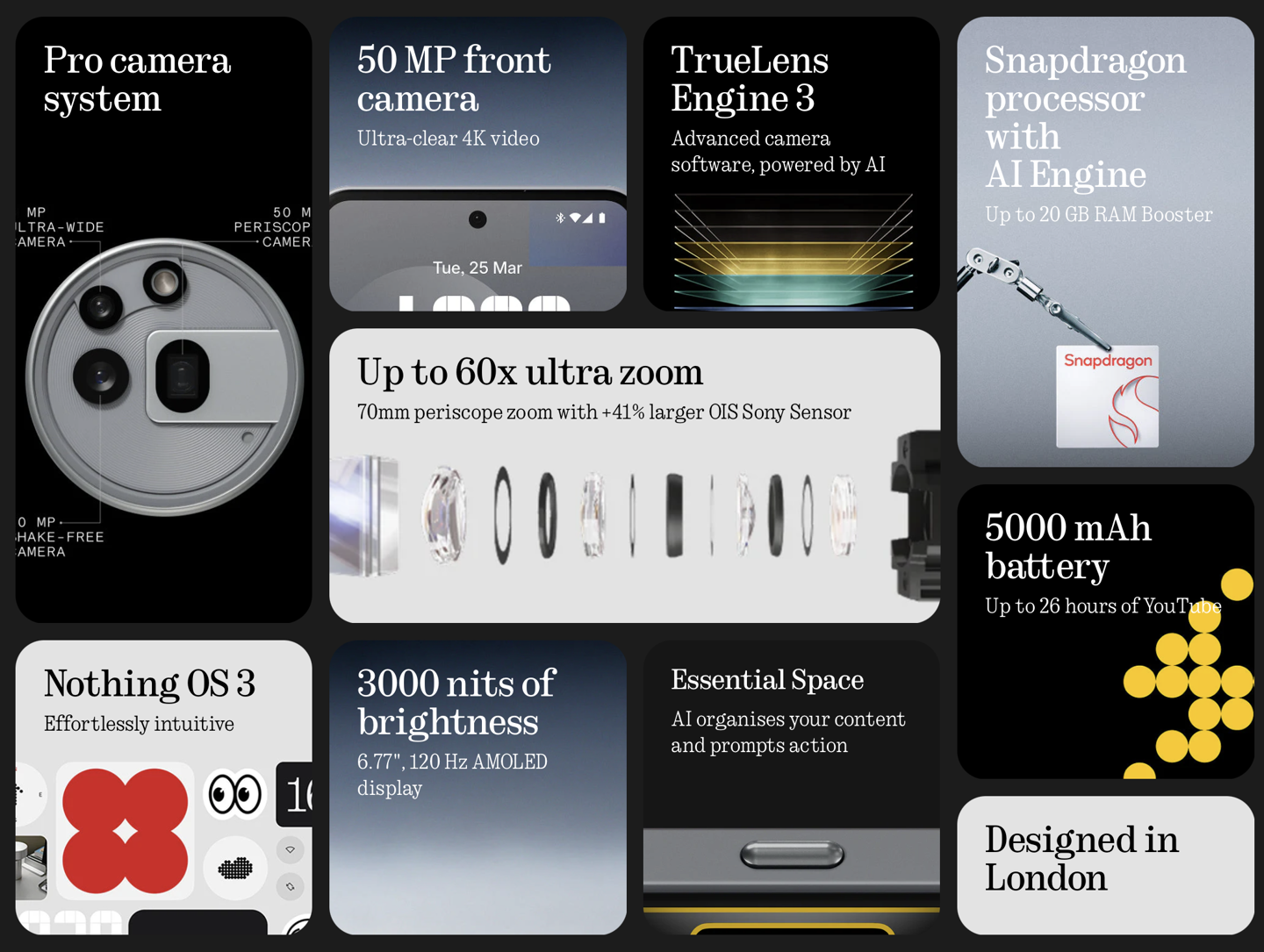 系列手机均预装基于安卓 15 的 Nothing OS 3.1 系统,搭载骁龙 7s Gen 3 芯片,配备 5000mAh 电池,支持 45W 充电。