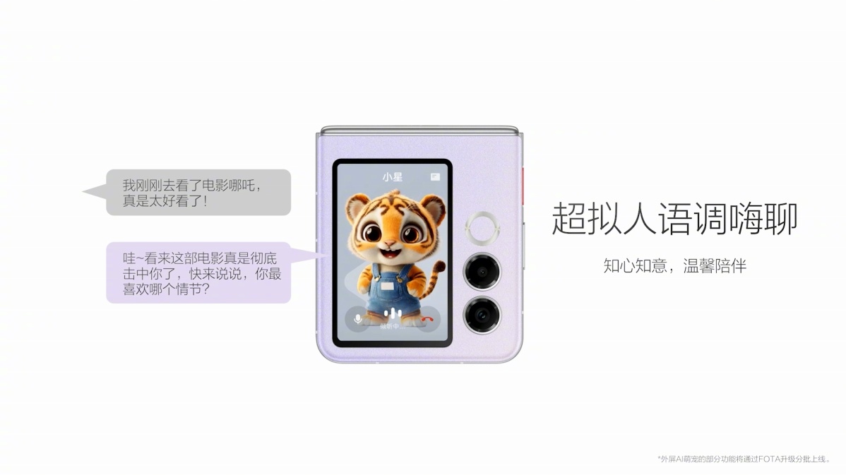 该机可通过星云引擎智能调用多种专家大模型,包括星云、豆包、DeepSeek 等等。努比亚 Flip 2 还支持折叠自动分屏功能,并内置星云 AI,可提供对话翻译、通话翻译等功能。用户不用展开手机,在外屏上即可直接使用桌宠来完成 AI 问答等操作,可聊天说话、答疑解惑,或完成更多日常操作。