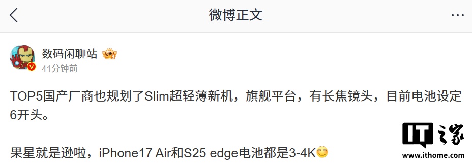 IT之家 3 月 4 日消息,博主 @数码闲聊站 今日发文透露,TOP5 国产厂商规划了 Slim 超轻薄新机,旗舰平台,有长焦镜头,目前电池容量设定 6 开头。博主表示,苹果三星的轻薄机型电池容量在 3000~4000mAh 左右。
