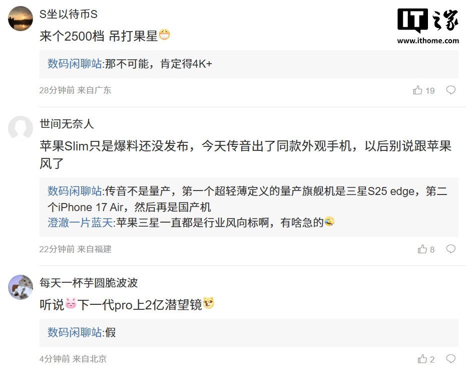 博主还在评论区回复了部分网友的问题:针对轻薄机型的价格是否会来到 2500 档,博主表示“那不可能,肯定得 4K+”;针对传音规划的相关机型,博主回复“传音不是量产,第一个超轻薄定义的量产旗舰机是三星 S25 edge,第二个 iPhone 17 Air,然后再是国产机”。