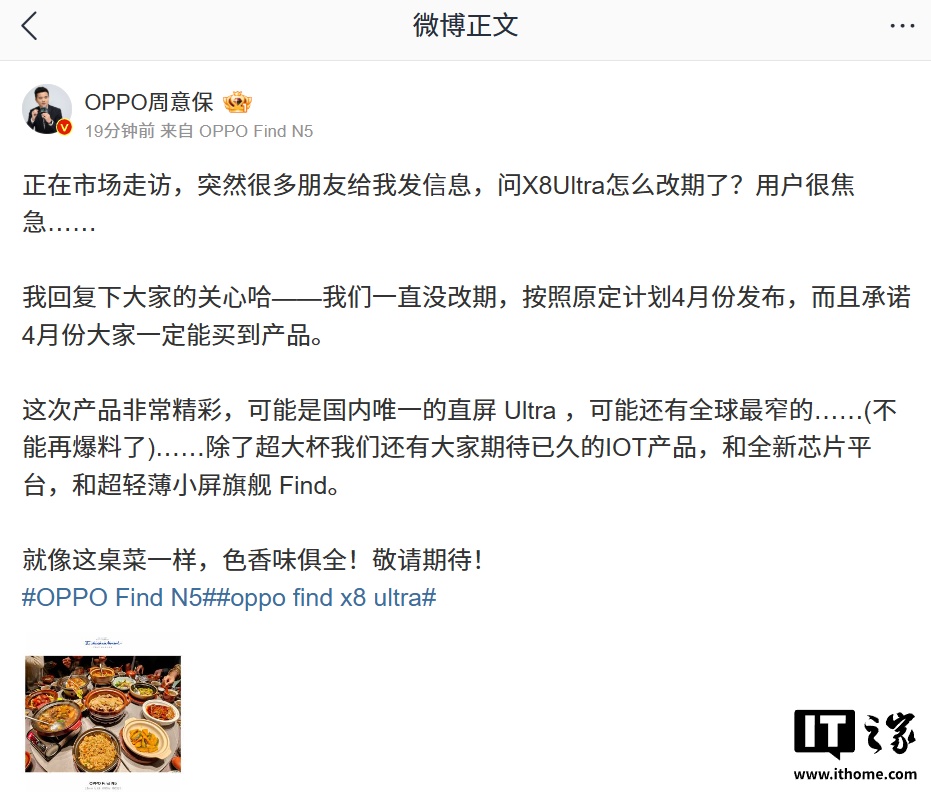 IT之家 3 月 4 日消息,OPPO Find 系列产品负责人周意保上月透露,Find X8 Ultra 手机将按照原定计划 4 月份发布,而且承诺 4 月份用户一定能买到产品。