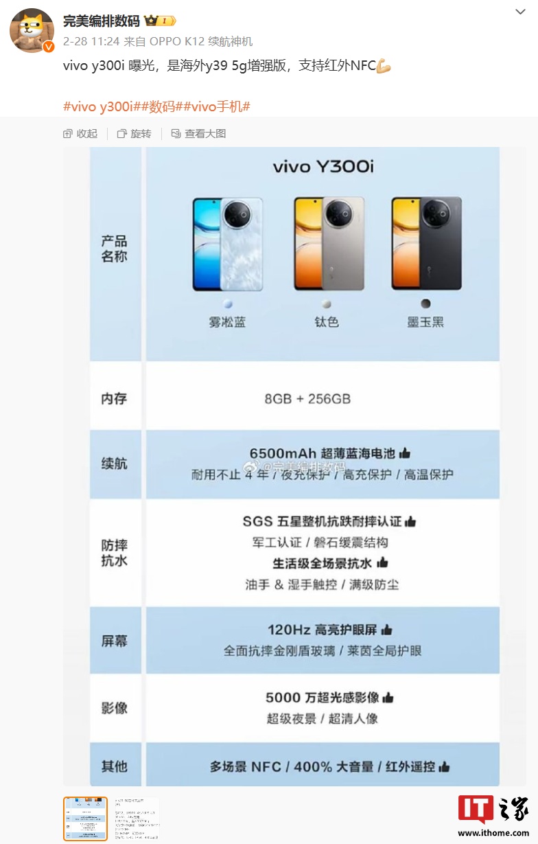 目前官网、电商平台暂未公布新机相关配置信息,IT之家注意到,博主 @完美编排数码 上月底透露,新机是海外 Y39 5G 手机的增强版,部分配置信息如下: