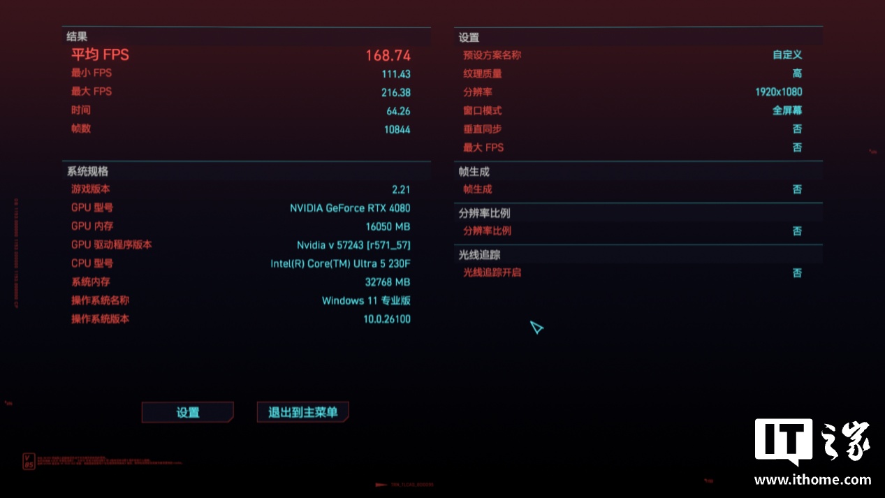 最后是性能要求最高的《赛博朋克:2077》,进入游戏后我们选择 1080P 分辨率,超级画质,运行游戏自带的基准测试,Ultra 5 230F 的平均帧数可以达到 168.7 帧。