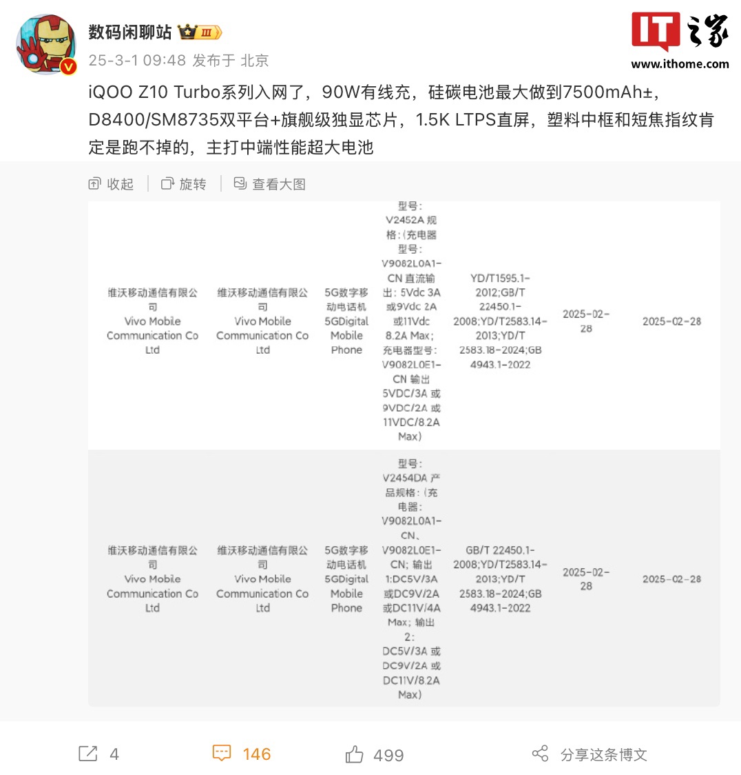 IT之家注意到,iQOO Z10 Turbo 系列手机现已正式入网,该机标准版搭载 D8400(联发科天玑 8400)处理器,Pro 版本配备 SM8735(骁龙 8s 至尊版)处理器,同时配备“旗舰级独显芯片”。不过,其中并没有提到骁龙 8 至尊版“越级中端机”,尚不确定新机的具体序列。