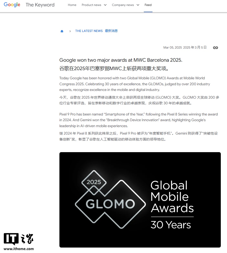 文章来源于互联网:IT之家-谷歌 Pixel 9 Pro 摘得 MWC 2025 年度智能手机奖,Gemini 获创新大奖