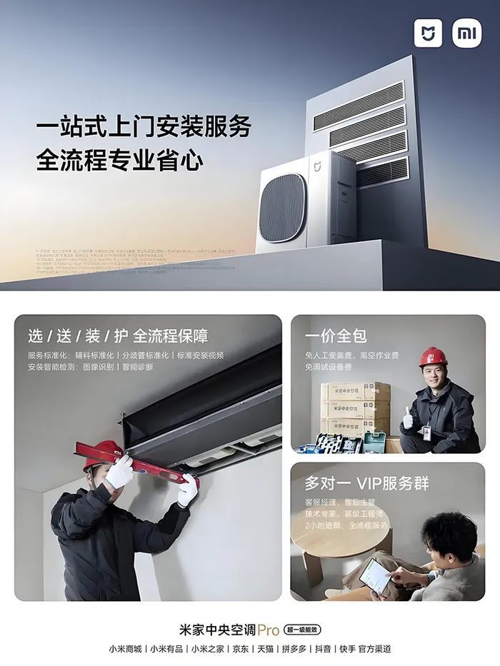 此外,小米也解决了中央空调的另一大难点——安装。在进行安装的过程中,一些收费乱象出现,往往会为消费者带来额外的花销。而米家中央空调Pro为小米直销,通过小米之家、小米官网等平台销售,避免中间经销商。同时,一价全包策略包含了安装费,将 安装过程做到了透明,解决了消费者最头疼的问题。