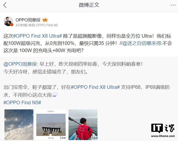 IT之家 3 月 6 日消息,周意保今日发文公布了 Find X8 Ultra 部分信息:新机除了是超旗舰影像,同时标配 100W 超级闪充,从 0 充至 100% 最快 35 分钟。