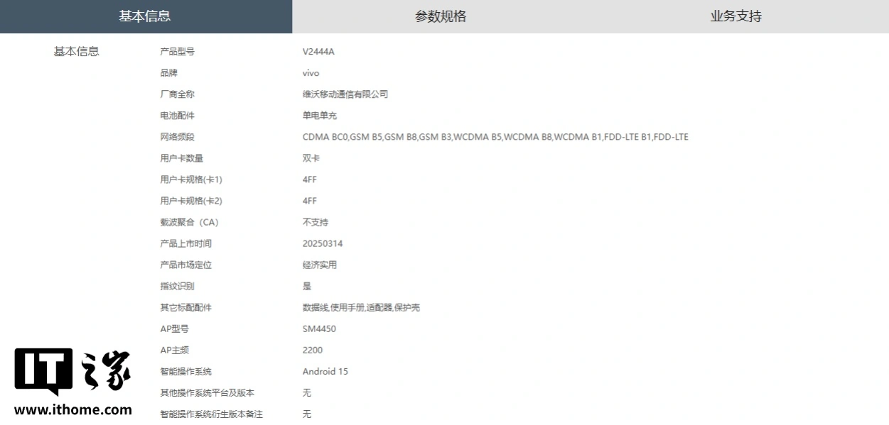 vivo Y300i 手机产品型号为 V2444A,市场定位“经济实用”,预装 Android 15 系统。新机尺寸为 165.70×76.30×8.09mm、重约 205g,分辨率 1608*720,内置 6500mAh 电池。