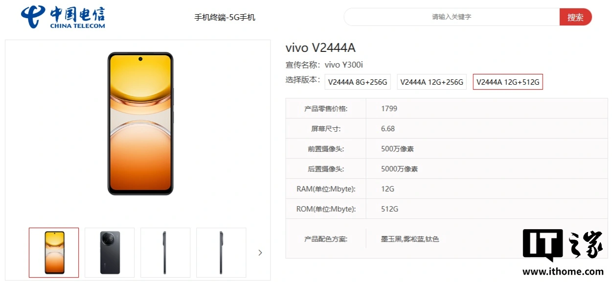 IT之家注意到,Y300i 手机已现身中国电信终端产品库,共 3 种规格版本,产品零售价 1499 元起。
