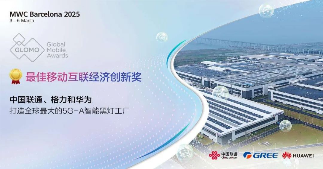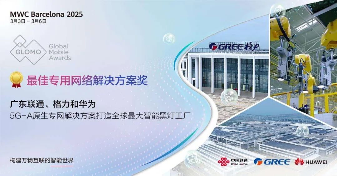 由中国联通携手格力、华为联合打造的 5G-A 智能黑灯工厂原生专网荣获 GSMA 全球移动大奖(GLOMO 奖)“最佳专用网络解决方案奖”(Best Private Network Solution),和“最佳互联经济移动创新奖”(Best Mobile Innovation for Connected Economy),标志着 5G-A 原生专网在智能制造领域正步入大规模部署阶段。三方在珠海格力高栏港工厂,围绕制造全流程打造了上万个智能移动联接,生产效率提升 86%,成本降低 20%,年产分体空调 1200 万台零缺陷。