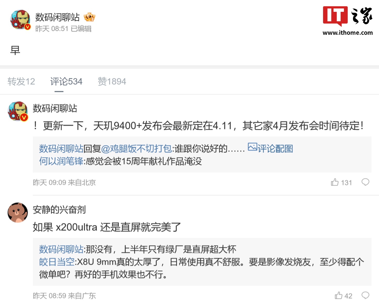 IT之家 3 月 7 日消息,消息人士 @数码闲聊站 昨日上午表示,联发科的天玑 9400+ 应用处理器发布会目前定档 4 月 11 日,其它企业的 4 月发布会时间待定。