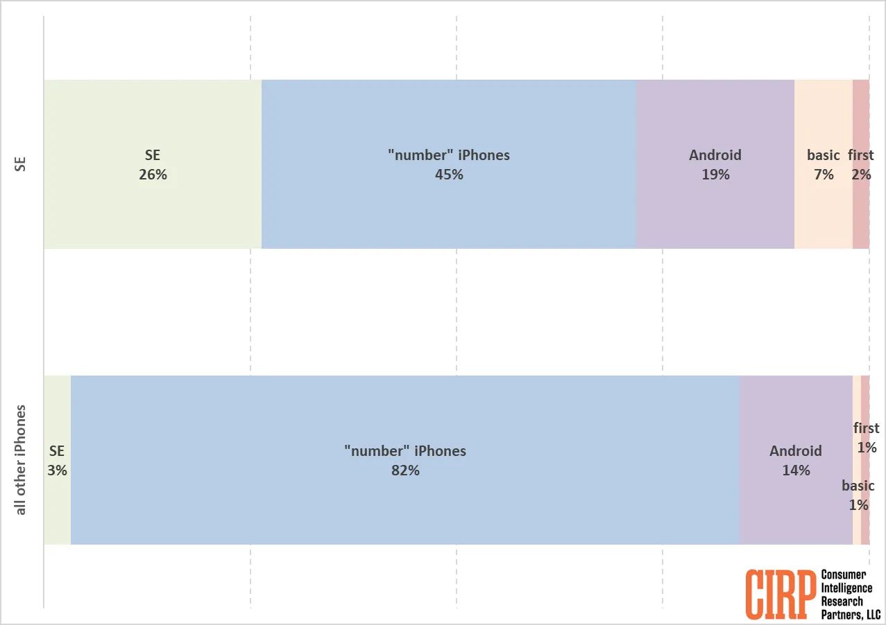 “数字”型号用户:45% 的 iPhone SE 购买者此前拥有“数字”型号 iPhone(如 iPhone 11、12 等),而其他 iPhone 的这一比例高达 82%。