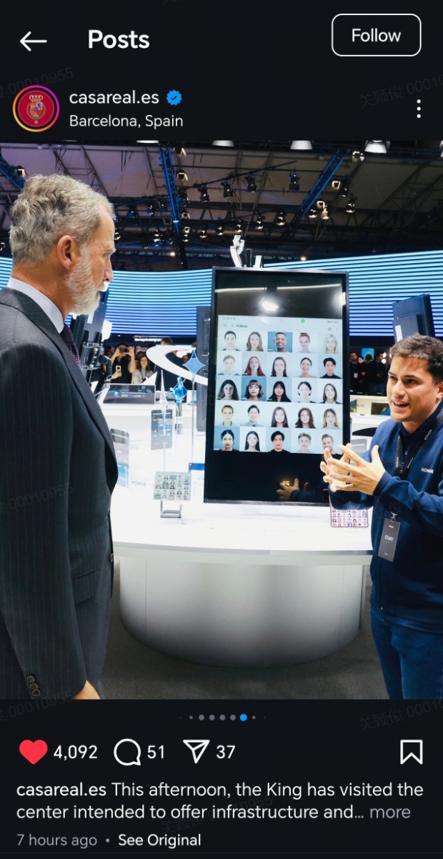 更甚者,荣耀的 AI 创新还引起了包括西班牙国王费利佩六世在内的众多知名人士的关注。国王对荣耀的 AI 换脸检测技术表现出极大兴趣,特别是其对 AI 深度伪造的精准识别能力。他赞赏了荣耀在这一领域的研发与努力。