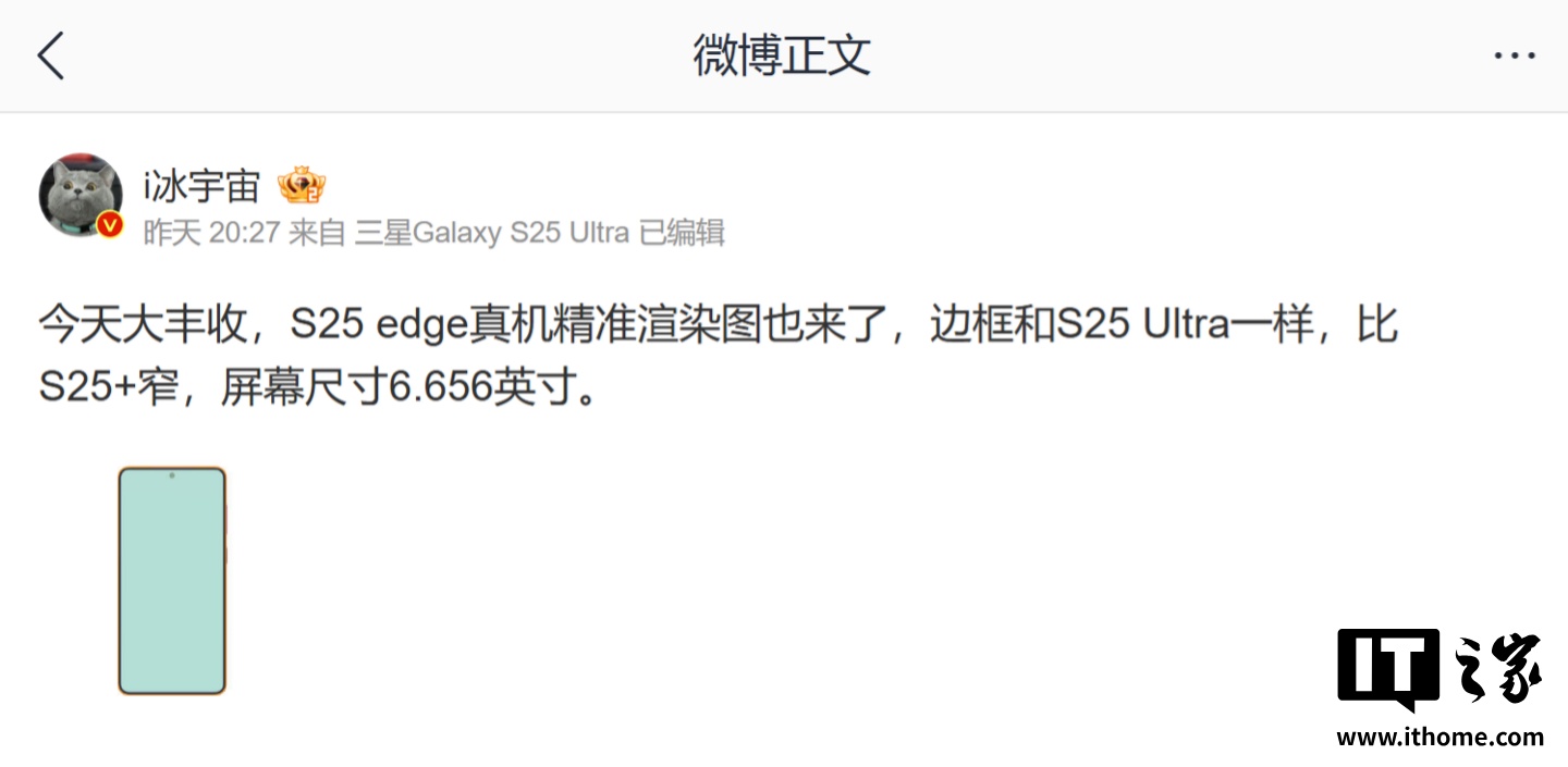 IT之家 3 月 8 日消息,消息源 @i冰宇宙 昨日(3 月 7 日)发布微博,曝料称三星最薄旗舰手机 Galaxy S25 Edge 机身重量为 162 克,厚度为 5.84 毫米,售价和 S25 + 差不多。