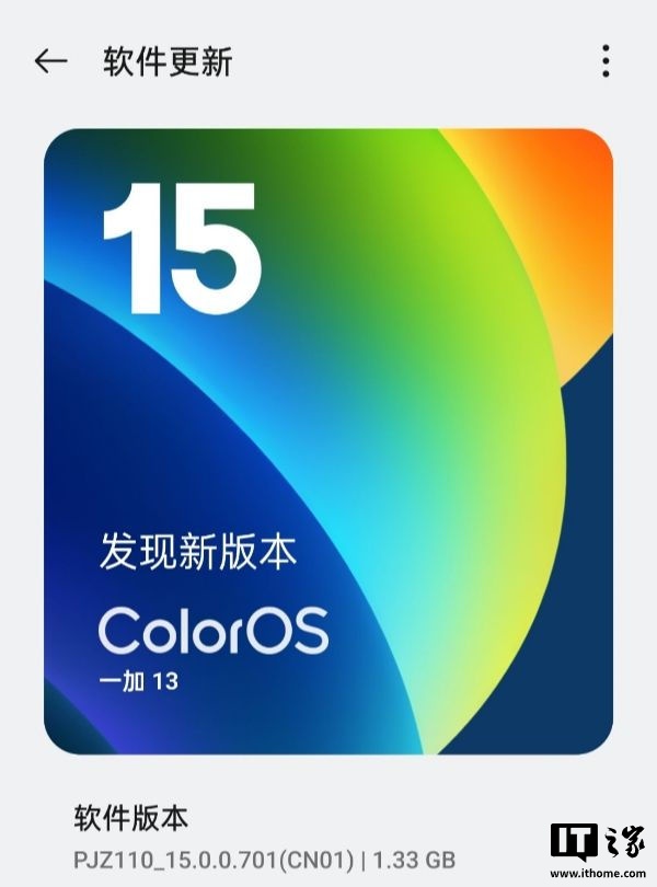 IT之家 3 月 9 日消息,一加 13 手机现获 ColorOS 15.0.0.701 版本升级,系统包大小约 1.33GB,新增行业首发的 AIGC 合成语音识别等功能。