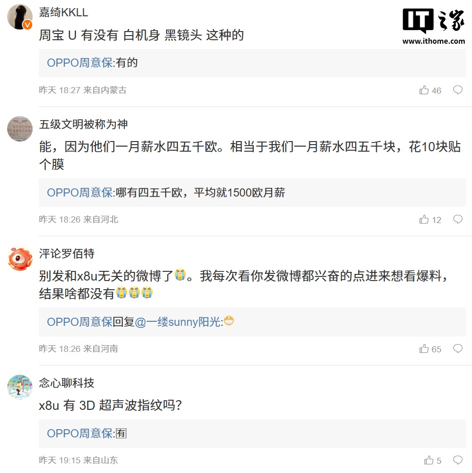 IT之家注意到,OPPO Find 系列产品负责人周意保昨日继续在评论区透露 Find X8 Ultra 信息:针对新机是否会提供“白机身 / 黑镜头”配色,他回复“有的”;针对新机是否配备 3D 超声波指纹,他表示“有”。另外,新机的规格情况也有信息露出:没有 24GB 运存版本、提供 1TB 存储规格版本。