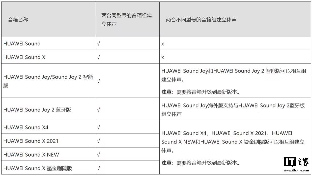 需要注意的是,华为 Sound 和华为 Sound X 两款音箱依旧仅支持两台同型号的音箱组建立体声,不支持不同型号的音箱组建立体声。支持组建立体声的华为智能音箱清单详情如下: