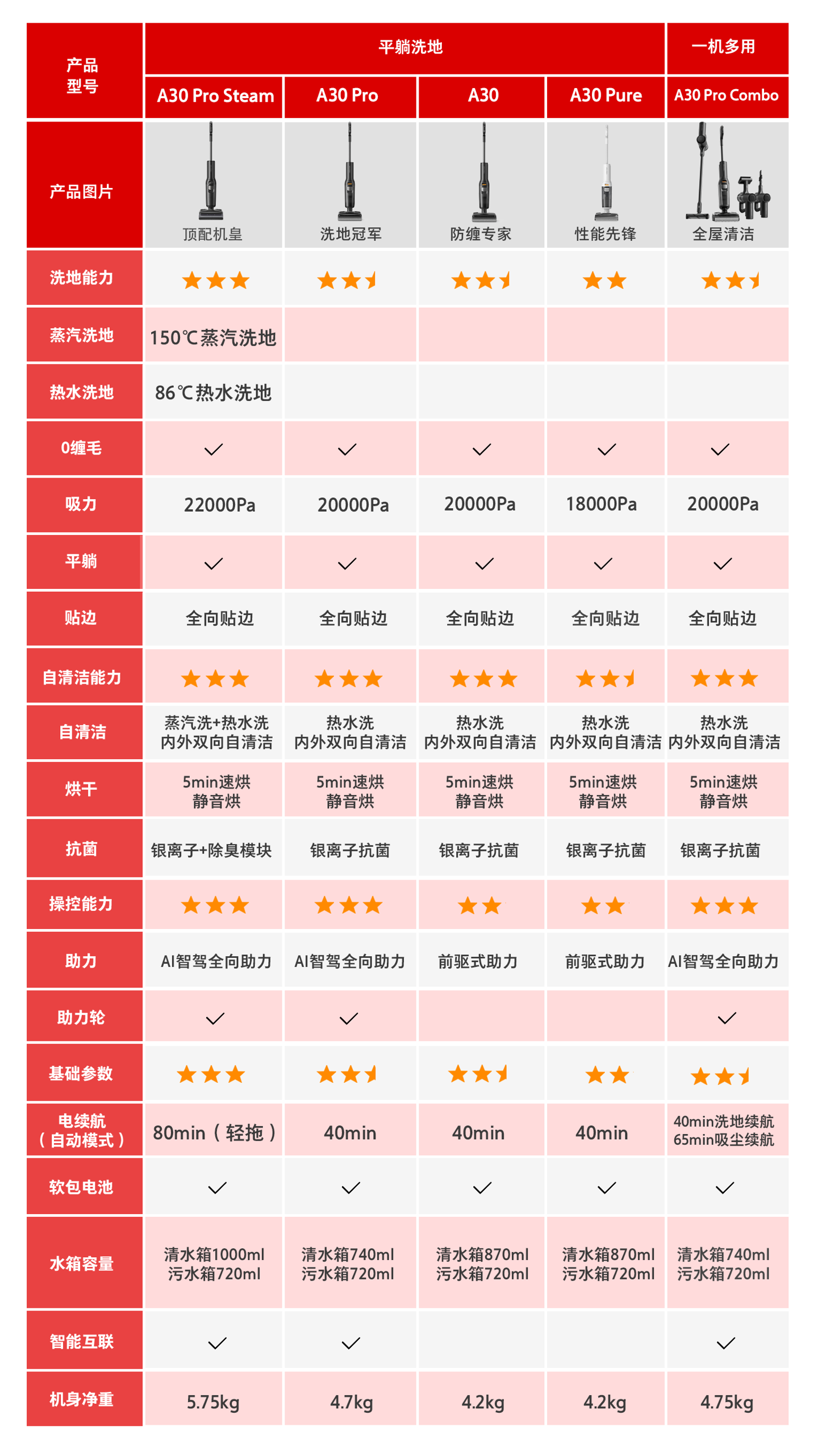当然,和 A30 系列相比,“Steam”增加的不仅仅是蒸汽洗和热水洗,还有 22000Pa 大吸力升级、污水箱新增除臭模块、电池容量提升至 6300mAh、增加脏污检测功能、150℃蒸汽自清洁等等。